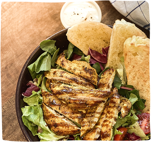 커리로 맛을 낸 닭가슴살에 토마토, 신선한 계절 야채가 조화를 이루어 식단 관리하기 좋은 담백한 샐러드